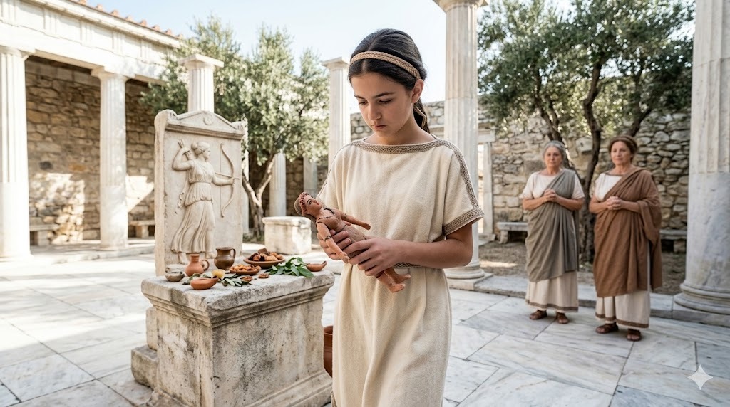 Όταν ένα κορίτσι έφτανε στην ηλικία της ενηλικίωσης, προσέφερε την κούκλα του σε θεές όπως η Άρτεμη ή η Αφροδίτη. Ήταν μια πράξη μετάβασης.