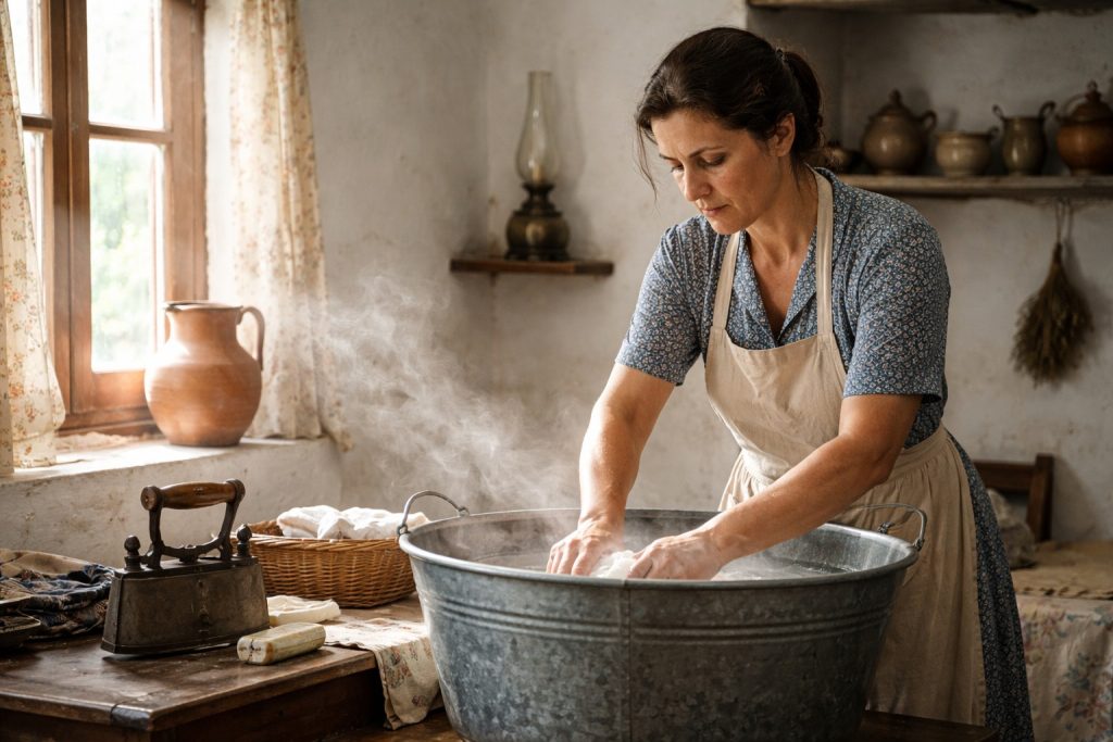 Και φυσικά υπήρχε η σκάφη. Το “πλυντήριο” της γιαγιάς. Ξύλινη ή μεταλλική, γεμάτη σαπουνάδα και τρίψιμο. Η μπουγάδα ήταν από τις πιο βαριές δουλειές του σπιτιού. Δεν υπήρχαν απορρυπαντικά με αρώματα. Μόνο πράσινο ή άσπρο σαπούνι και δυνατά χέρια.
