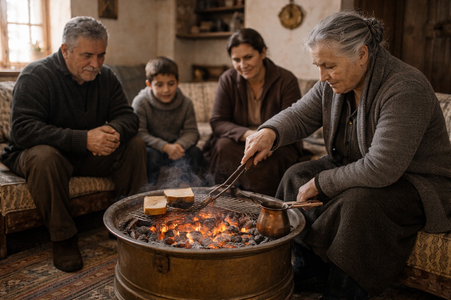 Η θέρμανση ήταν άλλη μια πρόκληση. Το μαγκάλι έμπαινε στη μέση του δωματίου. Με κάρβουνα και “πυρήνα” από κουκούτσια ελιάς.