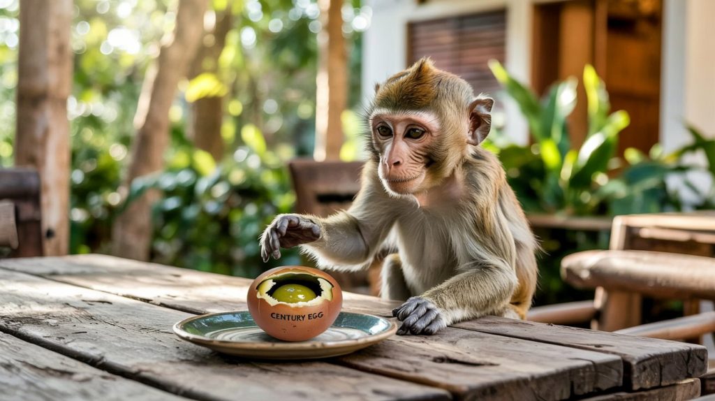 A video of a monkey with a “century egg” has gone viral on social media.