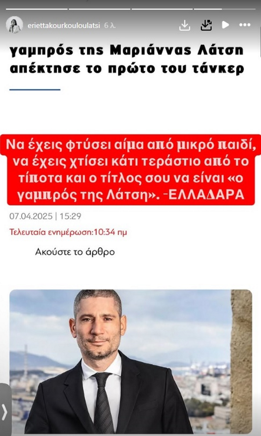 Σε μία από τις πιο δυναμικές της αναρτήσεις στο Instagram Stories, η Εριέττα Κούρκουλου Λάτση εξέφρασε τη δυσαρέσκειά της με τον εξής τρόπο: «Να έχεις φτύσει αίμα από μικρό παιδί, να έχεις χτίσει κάτι τεράστιο από το τίποτα και ο τίτλος σου να είναι “ο γαμπρός της Λάτση” – Ελλαδάρα».