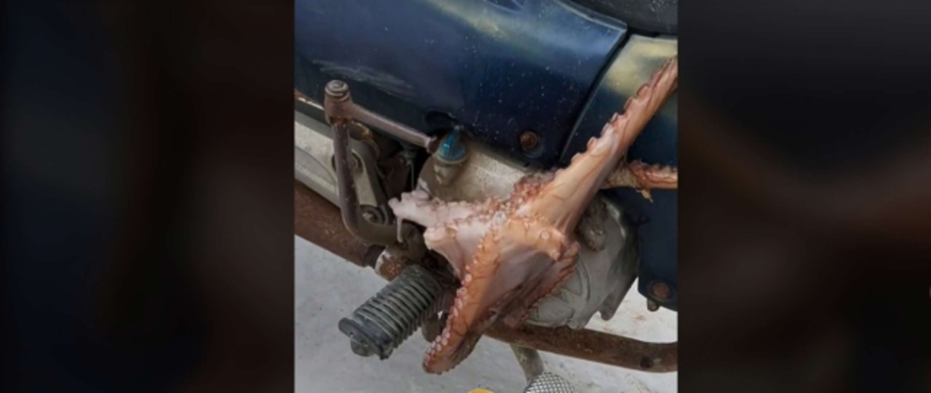 Ένας κάτοικος, όπως αναφέρει το cycladeslive.gr πήγε στη μηχανή του όταν είδε ένα χταπόδι να έχει βγει στο νερό και να έχει κολλήσει στο δίκυκλο.