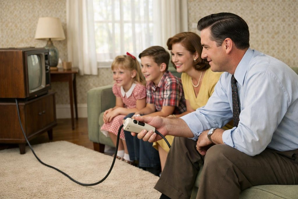 Στις αρχές της δεκαετίας του ’50, η τηλεόραση είχε αρχίσει να γίνεται βασικό κομμάτι του σπιτιού. Οι οικογένειες μαζεύονταν γύρω από τη συσκευή για να δουν ειδήσεις, σειρές και ζωντανά προγράμματα.