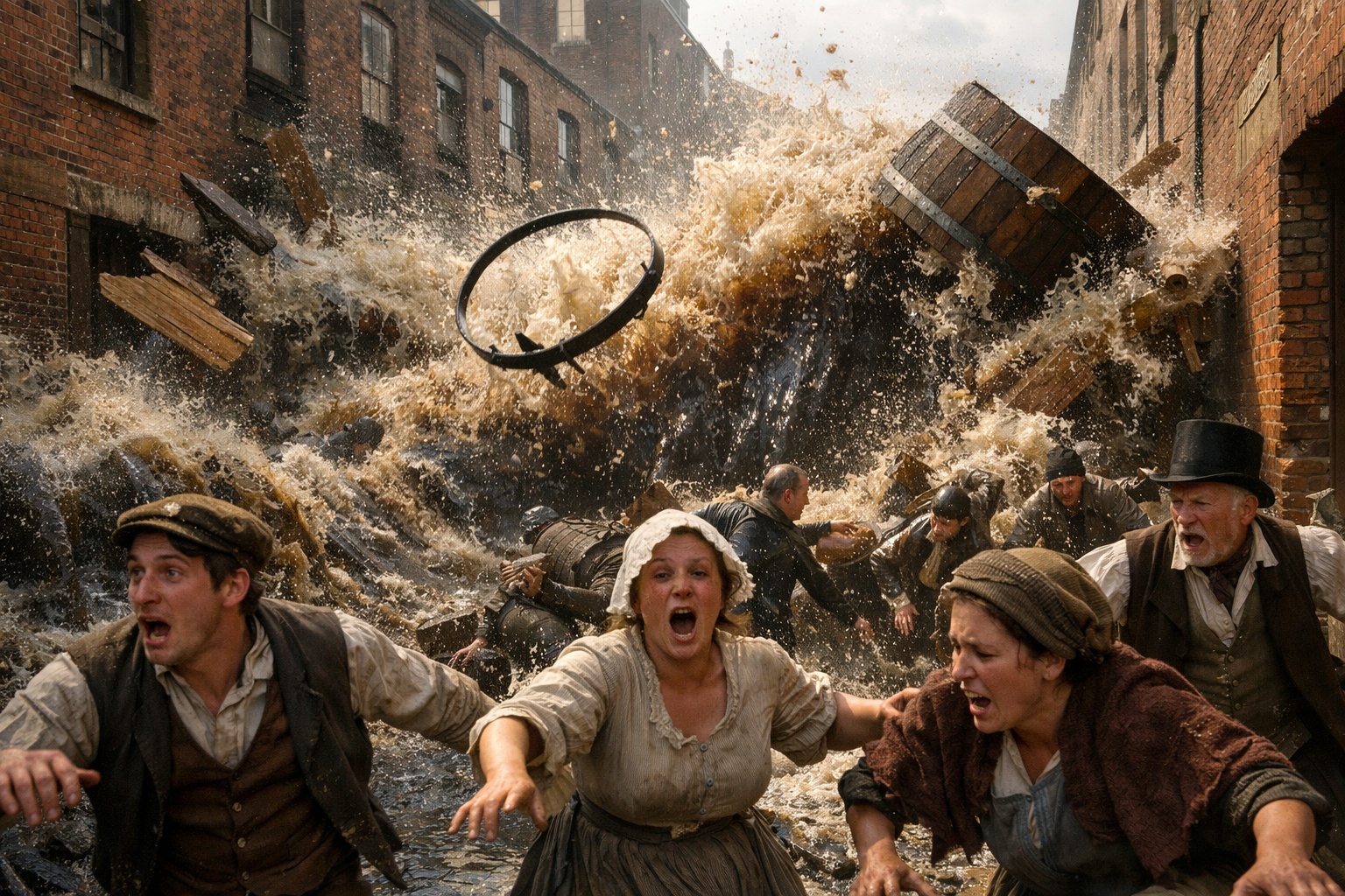 Βρισκόμαστε στο Λονδίνο του 1814 στην περιοχή St. Giles. Η ζυθοποιία Horse Shoe Brewery ήταν μια από τις μεγαλύτερες της πόλης. Ανήκε στην εταιρεία Meux and Company και παρήγαγε χιλιάδες λίτρα καθημερινά. Στο κέντρο του εργοστασίου δέσποζαν τεράστιες ξύλινες δεξαμενές. Αυτά τα βαρέλια είχαν ύψος πάνω από επτά μέτρα το καθένα. Συγκρατούνταν από βαριά σιδερένια στεφάνια που ζύγιζαν τόνους. Μέσα τους ωρίμαζε η περίφημη μπύρα τύπου porter που αγαπούσαν οι Λονδρέζοι. Η πίεση μέσα σε αυτές τις κατασκευές ήταν τρομακτική. Ένα μικρό ελάττωμα ήταν αρκετό για να προκαλέσει την απόλυτη καταστροφή.