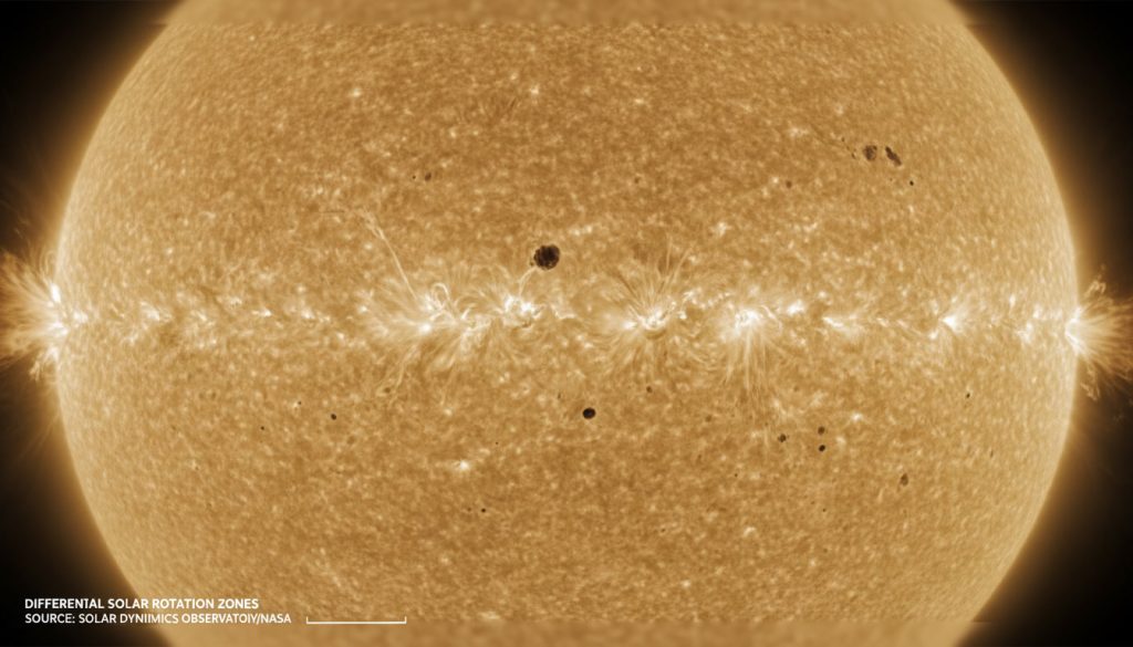 Ο ισημερινός του Ήλιου περιστρέφεται πιο γρήγορα, και αυτό προκαλεί περισσότερη ενέργεια και δραστηριότητα στην περιοχή, οδηγώντας σε πιο συχνές ηλιακές εκλάμψεις.