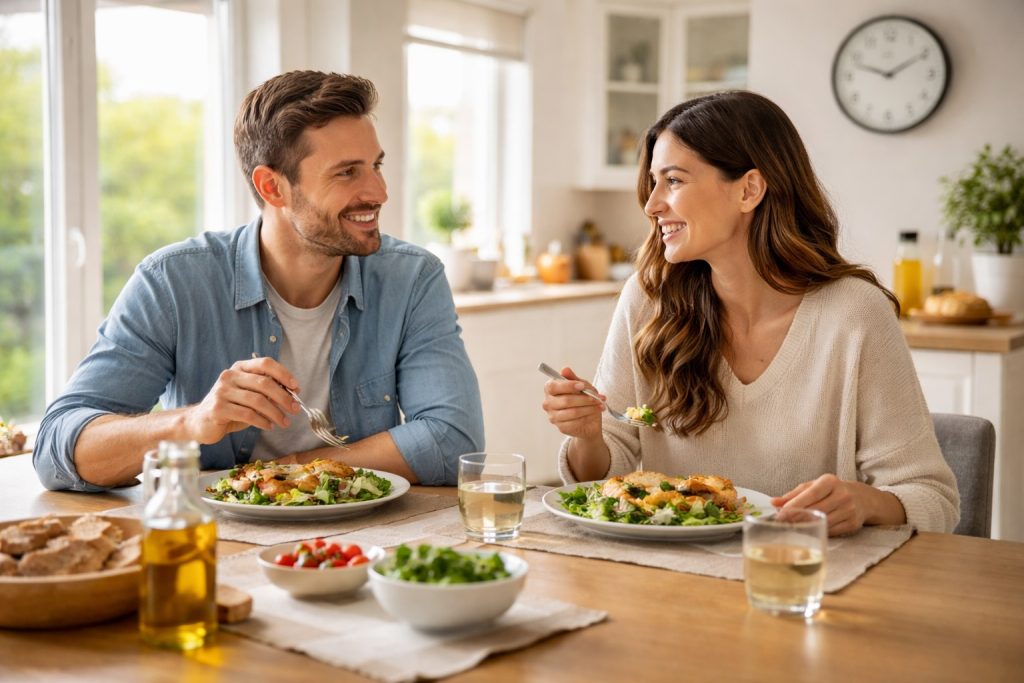 Όταν το βραδινό γεύμα καταναλώνεται περίπου την ίδια ώρα καθημερινά, ο μεταβολισμός λειτουργεί πιο ομαλά. Τα επίπεδα ενέργειας παραμένουν πιο σταθερά και μειώνονται τα επεισόδια έντονης πείνας.