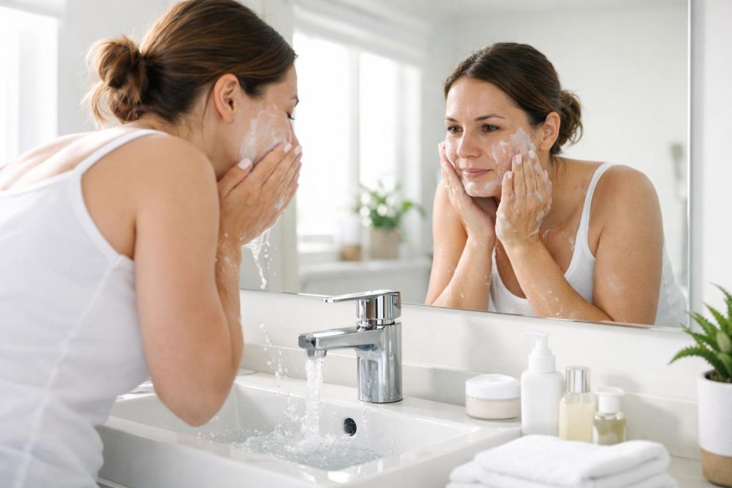 Δεν μετράει μόνο πόσες φορές πλένετε το πρόσωπό σας, αλλά και πώς. Πολύ ζεστό νερό μπορεί να ξηράνει το δέρμα, ενώ τα επιθετικά καθαριστικά το ερεθίζουν. Επιλέξτε χλιαρό νερό και προϊόντα κατάλληλα για τον τύπο σας.