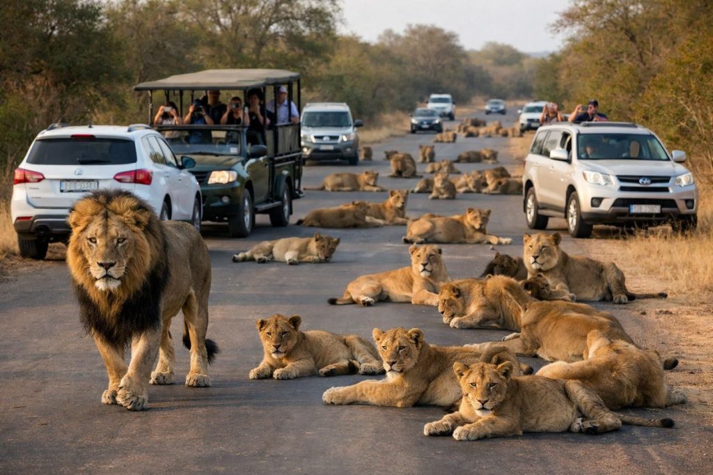 Το βίντεο που βλέπεις δείχνει κάτι που δεν βλέπει κανείς κάθε μέρα. Είσαι μέσα στο φημισμένο Kruger National Park στη Νότια Αφρική και ξαφνικά η κίνηση σταματά. Ο δρόμος δεν είναι φραγμένος από αυτοκίνητα, αλλά από ένα τεράστιο κοπάδι λιονταριών! Η αγέλη έχει καταλάβει τον δρόμο, και τα αυτοκίνητα περιμένουν υπομονετικά μέχρι να περάσουν τα ζώα.