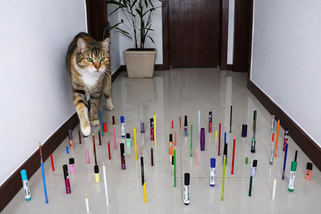 Ο γάτος αρχικά είναι πιο προσεκτικός. Μυρίζει γύρω του, εξερευνά τα εμπόδια και αποφασίζει πώς θα τα περάσει. Οι γάτοι είναι από τη φύση τους περίεργοι και ευέλικτοι, και αυτό φαίνεται καθώς πηδάει πάνω από χαμηλά εμπόδια και κινείται ανάμεσα σε κουτιά με χάρη και ευκολία.