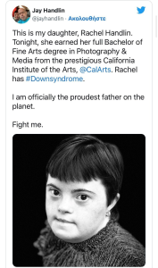 «Αυτή είναι η κόρη μου η Rachel. Σήμερα αποφοίτησε από το κολλέγιο. Η Rachel έχει σύνδρομο Down. Είμαι και επίσημα ο πιο περήφανος πατέρας του πλανήτη», έγραψε ο συγκινημένος μπαμπάς και συνόδευσε την ανάρτησή του με μια φωτογραφία της κόρης του.