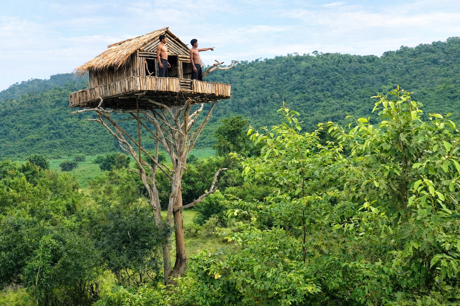 Τα πλάνα από την κατασκευή δείχνουν μια δομή που μοιάζει με παραδοσιακή ξύλινη καλύβα, αλλά εξελιγμένη. Κάθε τμήμα είναι προσεκτικά δεμένο με μπαμπού, χωρίς να φαίνεται μεγάλη χρήση μεταλλικών υλικών. Το σπίτι στέκεται πάνω σε έναν «κορμό» από ξύλο ή μπαμπού, με τη βάση του να στηρίζεται σταθερά παρά το μεγάλο ύψος. Αυτό δείχνει πόσο σημαντικό είναι να γνωρίζεις τα υλικά και πώς να τα χρησιμοποιείς για να δημιουργήσεις μια δομή που μπορεί να αντέξει στα στοιχεία της φύσης.