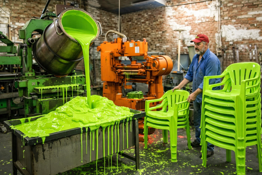 Το επόμενο βήμα είναι το πιο εντυπωσιακό. Το ρευστό πλαστικό διοχετεύεται σε καλούπια που έχουν το σχήμα της καρέκλας. Τα καλούπια αυτά είναι τεράστια και πολύ βαριά, γιατί πρέπει να αντέχουν σε πολύ μεγάλη πίεση. Όταν το λιωμένο πλαστικό γεμίσει τα καλούπια, η πίεση το πιέζει ώστε να πάρει ακριβώς το σχήμα της καρέκλας. Μετά, πρέπει να κρυώσει αρκετά ώστε να «σταθεροποιηθεί» και να μπορεί να αφαιρεθεί από το καλούπι χωρίς να παραμορφωθεί.