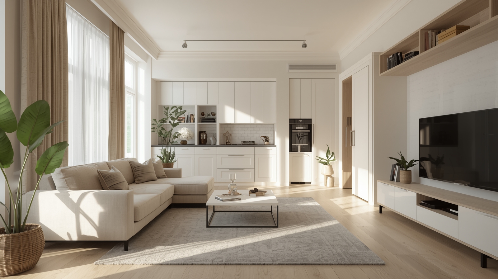 Η χρήση του ίδιου δαπέδου σε όλο το σπίτι μπορεί να κάνει το χώρο να φαίνεται μεγαλύτερος και ενιαίος. Ένα ελαφρύ ξύλινο δάπεδο, όπως η ανοιχτόχρωμη δρυς, μπορεί να φωτίσει το δωμάτιο και να το κάνει να φαίνεται πιο ανοιχτό. Τοποθετώντας χαλιά για άνεση, διατηρείτε μια αίσθηση ροής σε όλο το σπίτι, χωρίς να περιορίζετε την ευχέρεια κίνησης.