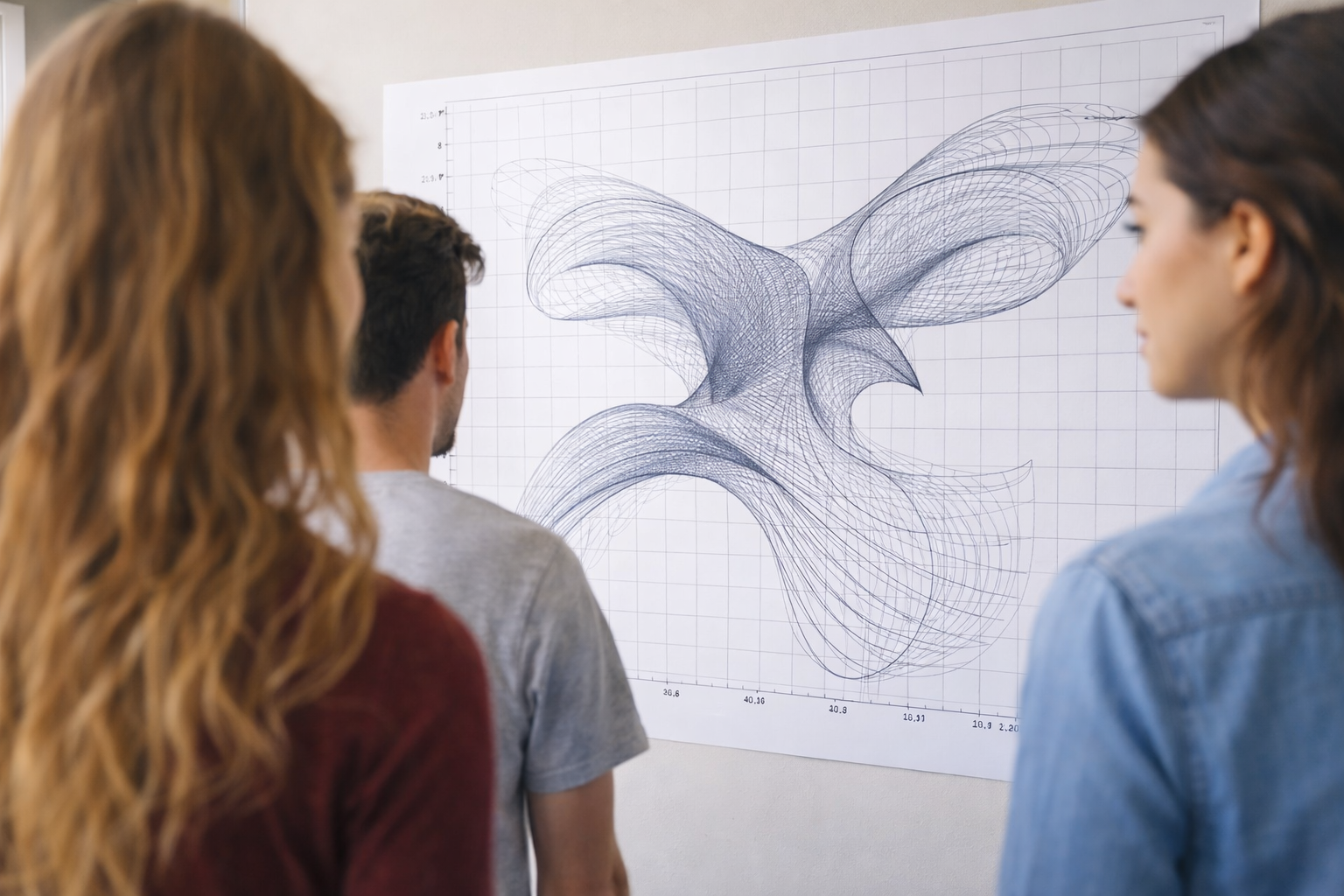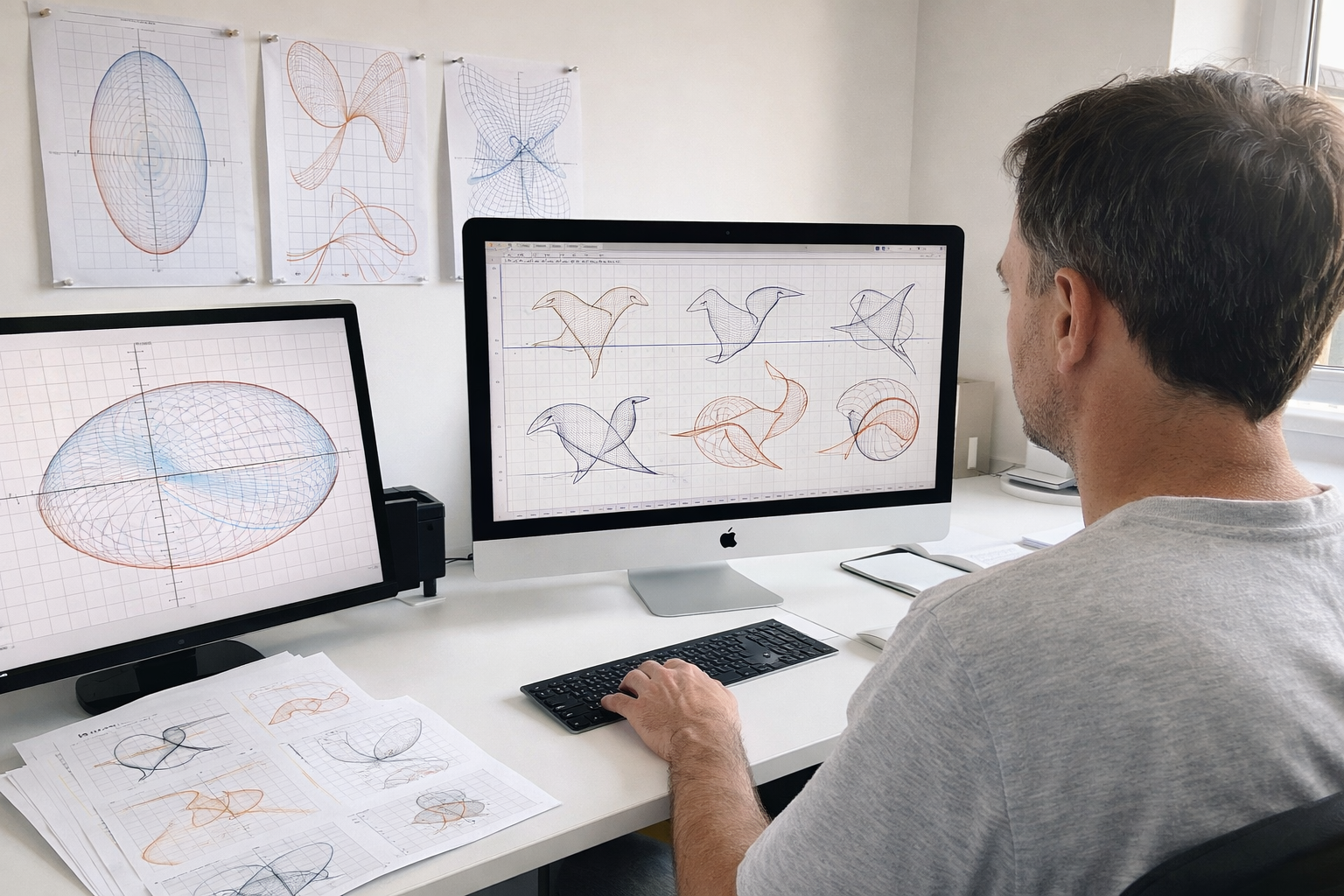 Με την πρώτη ματιά, τα έργα του μοιάζουν σαν να έχουν σχεδιαστεί με μολύβι ή πινέλο. Γραμμές που κινούνται αρμονικά, καμπύλες που σχηματίζουν μορφές και εικόνες που θυμίζουν τη φύση. Κι όμως, πίσω από όλα αυτά δεν υπάρχει καμία καλλιτεχνική πινελιά με την κλασική έννοια. Υπάρχουν μόνο μαθηματικά.