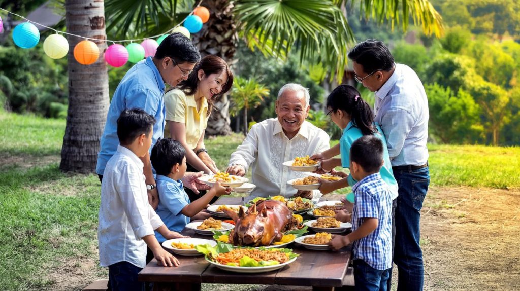 Στις Φιλιππίνες, το φαγητό είναι ιερό — ειδικά όταν πρόκειται για γενέθλια. Οι οικογένειες ετοιμάζουν πλούσια γεύματα με παραδοσιακά πιάτα όπως pancit (μακαρόνια μακροζωίας), lechon (ψητό γουρουνόπουλο), και lumpia (ρολά spring). Το pancit έχει και συμβολισμό — πιστεύεται ότι φέρνει μακροζωία, γι’ αυτό δεν λείπει ποτέ από το τραπέζι.