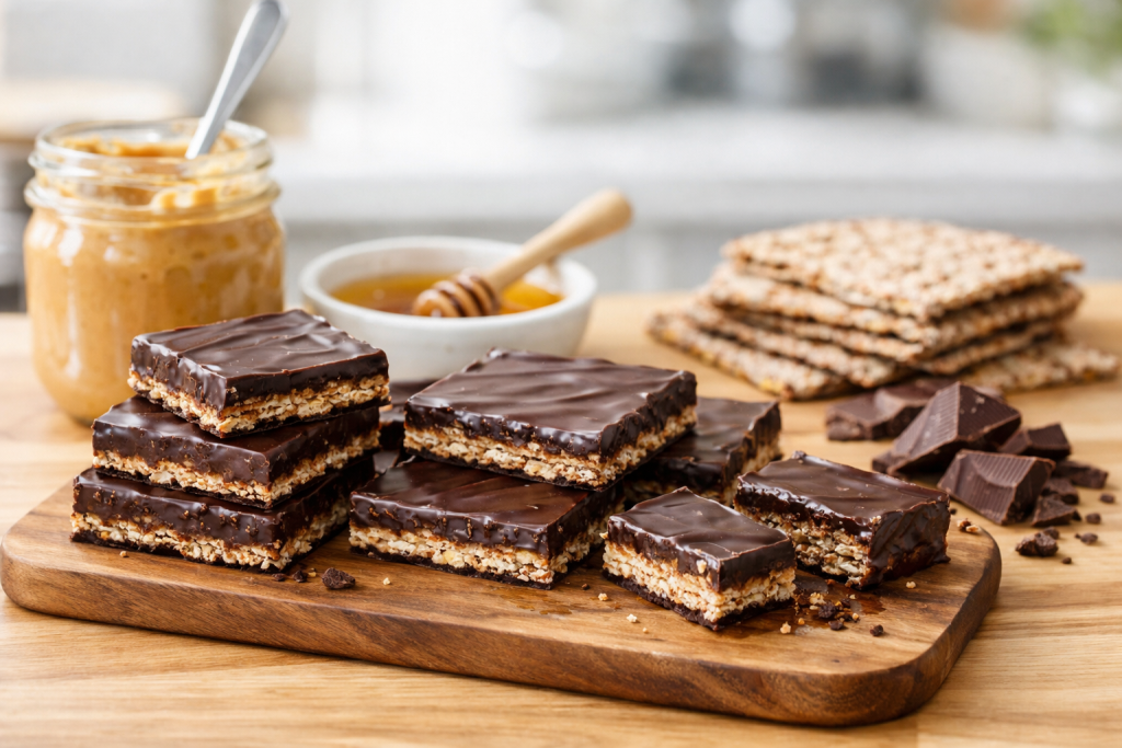 Θα χρειαστείτε φυστικοβούτυρο, μέλι, κουβερτούρα στέβια ή σοκολάτα με 100% κακάο και φρυγανιές σουηδικού τύπου, ιδανικά ολικής άλεσης. Τίποτα παραπάνω.