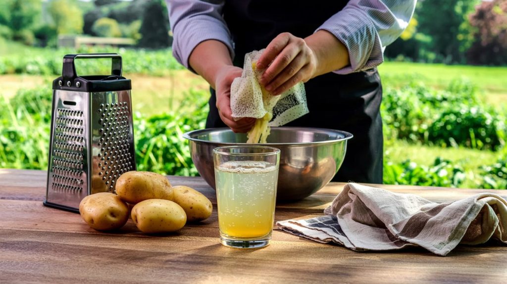 Ο χυμός πατάτας προέρχεται από ωμές πατάτες που έχουν καθαριστεί, τριφτεί και στραγγιστεί ώστε να εξαχθεί το υγρό τους. Ναι, ωμές! Δεν χρειάζεται βράσιμο ή ψήσιμο. Η διαδικασία είναι απλή και μπορείτε να την κάνετε εύκολα στο σπίτι. Το μόνο που χρειάζεστε είναι φρέσκες πατάτες, έναν τρίφτη και ένα τουλπάνι ή σουρωτήρι.