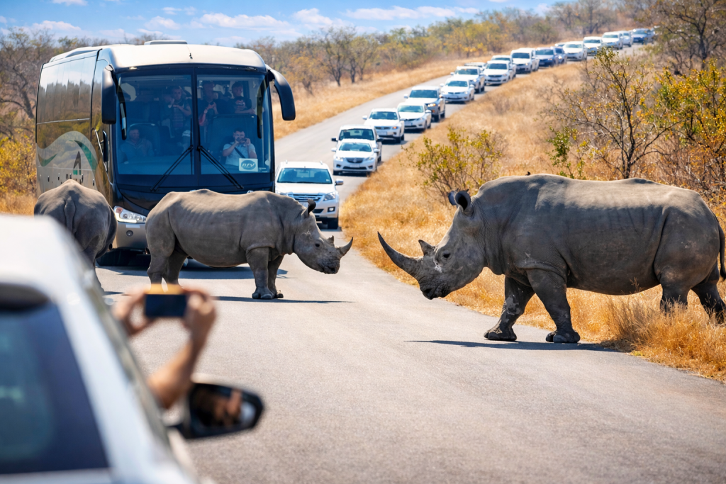 Στο Εθνικό Πάρκο Κρούγκερ της Νότιας Αφρικής, οι κανόνες οδικής κυκλοφορίας είναι λίγο διαφορετικοί από αυτούς που έχουμε συνηθίσει. Εκεί, την προτεραιότητα δεν την έχουν τα αυτοκίνητα, αλλά οι μόνιμοι κάτοικοι της περιοχής: τα ζώα. Σε μια πρόσφατη περιήγηση, οι επισκέπτες βρέθηκαν μπροστά σε ένα θέαμα που σπάνια συναντά κανείς, ακόμα και σε ένα τόσο διάσημο πάρκο. Ένας ολόκληρος πληθυσμός από ρινόκερους αποφάσισε να κάνει την εμφάνισή του ακριβώς στη μέση του δρόμου, δημιουργώντας το πιο ασυνήθιστο μποτιλιάρισμα που έχει καταγραφεί ποτέ.