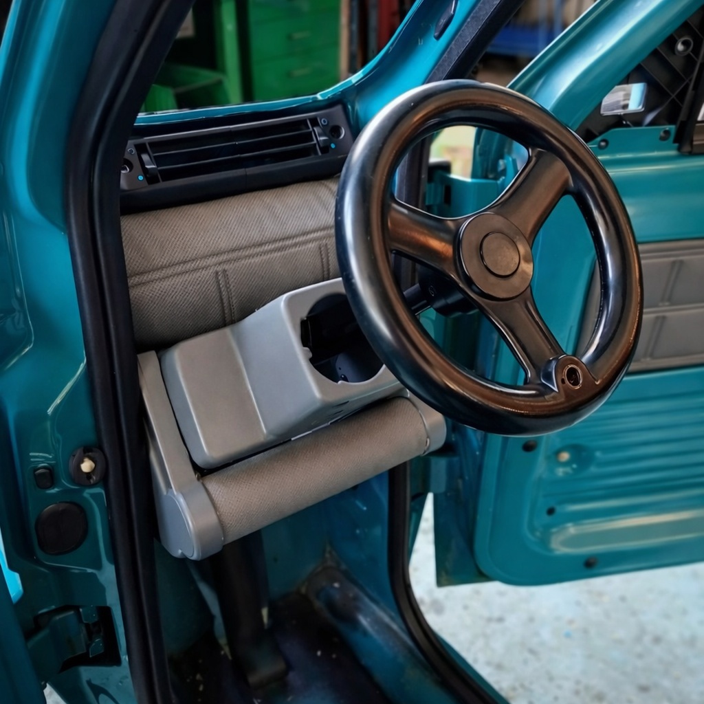 Το αποτέλεσμα; Ένα όχημα τόσο στενό που μοιάζει περισσότερο με ποδήλατο παρά με αυτοκίνητο. Και όμως, είναι πλήρως λειτουργικό.