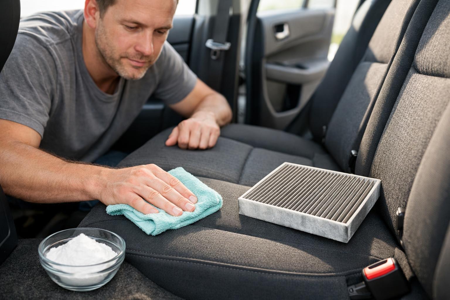 Η μυρωδιά τσιγάρου “κολλάει” κυρίως στα καθίσματα και στην οροφή του αυτοκινήτου. Αν είναι υφασμάτινα, χρησιμοποιήστε ειδικό καθαριστικό ταπετσαριών ή ένα μείγμα από ξύδι και νερό (1:1). Ψεκάστε ελαφρά και σκουπίστε με πανί μικροϊνών. Αν έχετε δερμάτινα καθίσματα, προτιμήστε καθαριστικά δέρματος για να αποφύγετε τη φθορά.