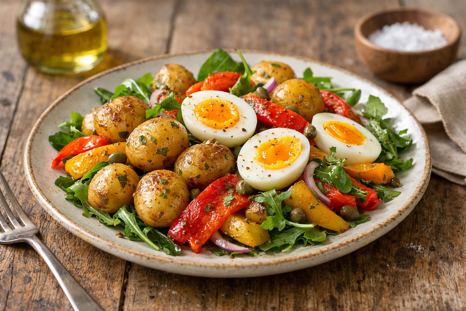 Αυτή η ζεστή σαλάτα με πατάτες και αυγά είναι ιδανική για κάθε εποχή. Είναι εύκολη και γρήγορη, αλλά και πολύ θρεπτική. Όλα τα υλικά που χρησιμοποιούνται είναι φυσικά και γεμάτα θρεπτικά συστατικά, ενώ η γεύση της είναι τόσο απολαυστική που θα σας κάνει να την προσθέσετε στο μενού σας πιο συχνά. Επιπλέον, μπορείτε να τη σερβίρετε ως κυρίως πιάτο ή ως συνοδευτικό για το κρέας ή τα ψάρια σας.